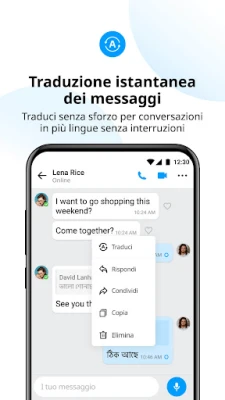 Oltre alle chiamate, imo è il tuo centro di messaggistica completo. Scambia messaggi di testo istantanei, note vocali e condividi momenti attraverso foto e video di qualità originale. Hai bisogno di inviare documenti importanti? imo gestisce file di ogni tipo – dai .DOC agli .MP3, dai .ZIP ai .PDF – mantenendone l'integrità. Tutta la cronologia dei tuoi messaggi e i tuoi file possono essere salvati in modo sicuro nel imo Cloud, liberando spazio prezioso sul tuo dispositivo. Supera le barriere linguistiche con la traduzione istantanea dei messaggi di testo, rendendo le conversazioni globali accessibili e senza sforzo.