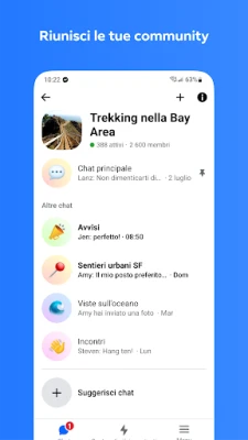 Vai oltre le conversazioni individuali: costruisci e nutri le tue community su Messenger, trovando il tuo spazio tra persone che condividono le tue passioni, siano essi compagni di studi, vicini o gruppi di interesse. Segui i tuoi creator preferiti iscrivendoti ai loro canali broadcast per accedere a contenuti esclusivi e spontanei, rimanendo sempre aggiornato. Dai sfogo alla tua creatività con Meta AI, il tuo partner ideale per ideare, animare e trasformare immagini, portando le tue visioni a un nuovo livello. E per i momenti quotidiani, cattura e condividi brevi istantanee nelle Storie o lascia veloci pensieri nelle Note, entrambi visibili per 24 ore. Infine, personalizza ogni interazione: scegli tra una vasta gamma di sticker, GIF e reazioni per esprimere ogni emozione, e modella l'atmosfera delle tue chat con temi vivaci e sempre aggiornati.