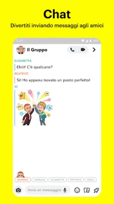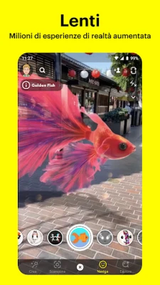 Immergiti nell'universo visivo di Snapchat, dove l'espressione è protagonista. L'esperienza prende vita direttamente dalla fotocamera, permettendoti di catturare istantaneamente foto o registrare video con un semplice tocco prolungato. Scatena la tua creatività con una vasta gamma di Lenti, Filtri vivaci e Bitmoji personalizzati, trasformando ogni istante in un'opera d'arte unica. Ogni giorno, nuove Lenti create dalla dinamica community di Snapchat ti offrono modi sempre originali per esprimere il tuo stile.